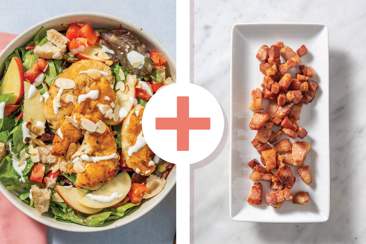 • Divide crouton salad between bowls. Top with chicken and bacon. • Drizzle over ranch dressing. • Sprinkle over flaked almonds to serve. Enjoy!