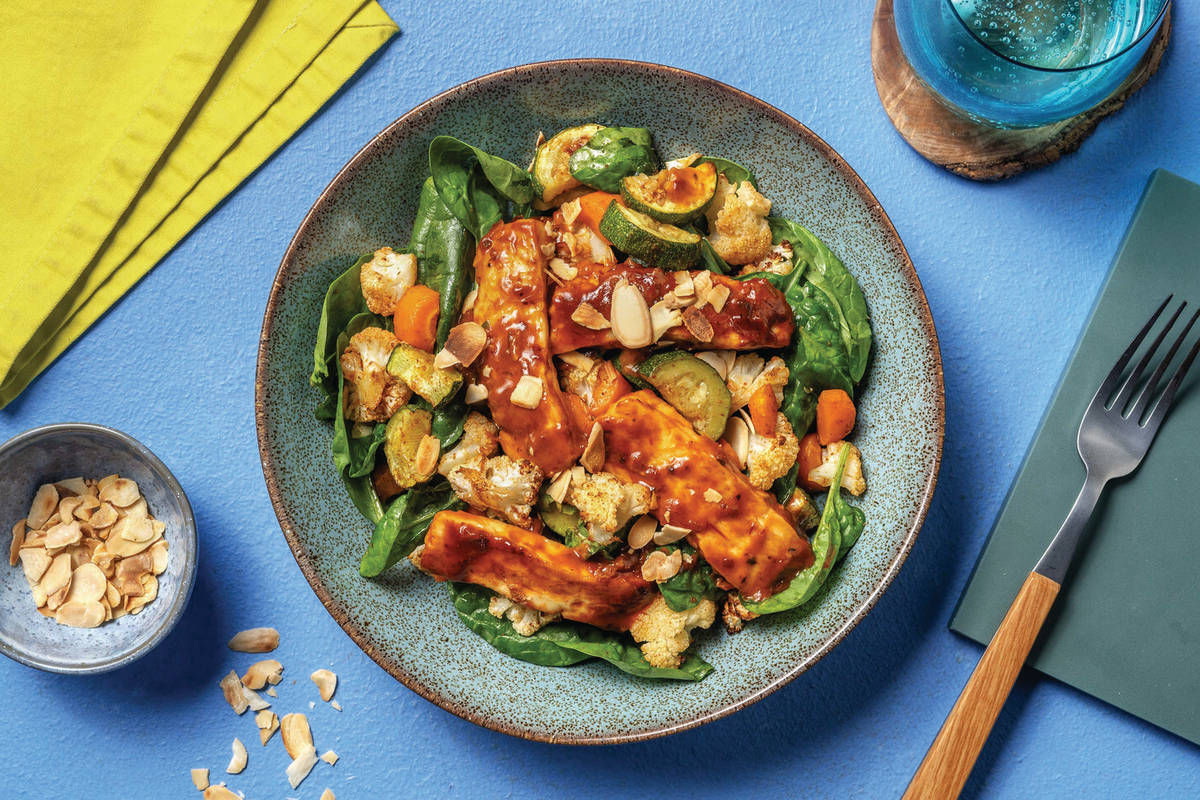 • Divide Mexican veggie toss between bowls. Top with honey-chipotle haloumi, spooning over any remaining glaze from the pan. • Sprinkle with flaked almonds to serve. Enjoy!