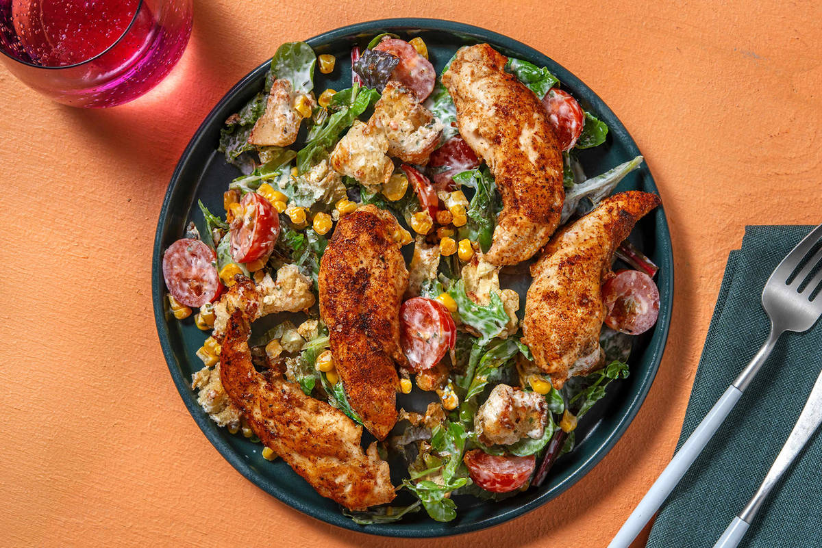 Topped with perfectly seasoned chicken tenders and brought together with crisp ciabatta croutons and creamy ranch dressing, this is our kind of salad! The seared chicken meets the sweet bursts of cherry tomato which add a pop of colour and some acidity to balance the richness. *This recipe is under 650kcal per serving and under 40g carbohydrates per serving.*