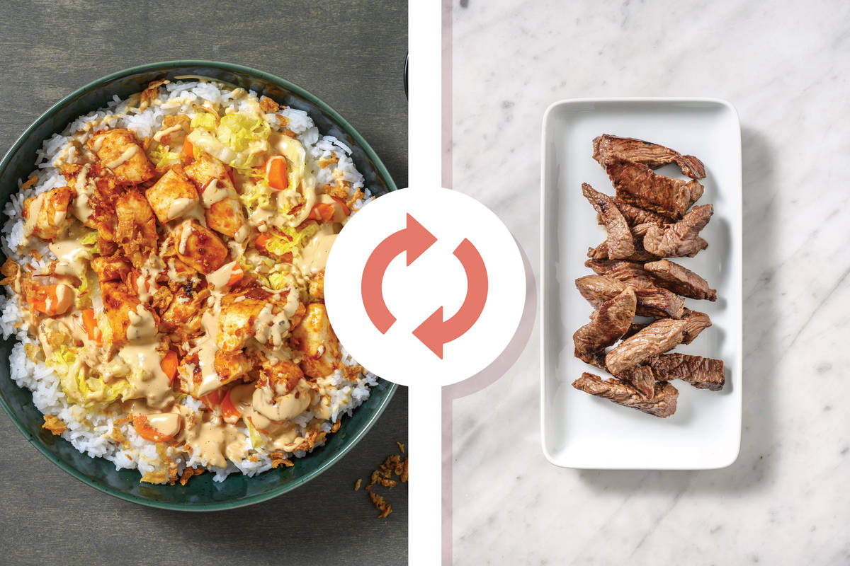 • In a large frying pan, heat a drizzle of olive oil over medium-high heat. Cook carrot with a splash of water, tossing, until tender, 4-5 minutes. Add shredded cabbage mix and cook until wilted, 2 minutes. Season with salt and pepper. Transfer to a bowl and cover to keep warm. • Return frying pan to high heat with a drizzle of olive oil. When oil is hot, cook chicken, tossing, until cooked through (when no longer pink inside), 4-5 minutes. Remove pan from heat, then add Sichuan garlic paste, tossing chicken to coat. ~~~~~~~~~~ MODULAR STEP ~~~~~~~~~~ Custom Recipe: If you've swapped to beef strips, cook veggies as above. Return pan to a high heat with a drizzle of olive oil. When oil is hot, cook beef, in batches, until browned and cooked through. Return all beed to the pan and add Sichuan garlic paste as above.