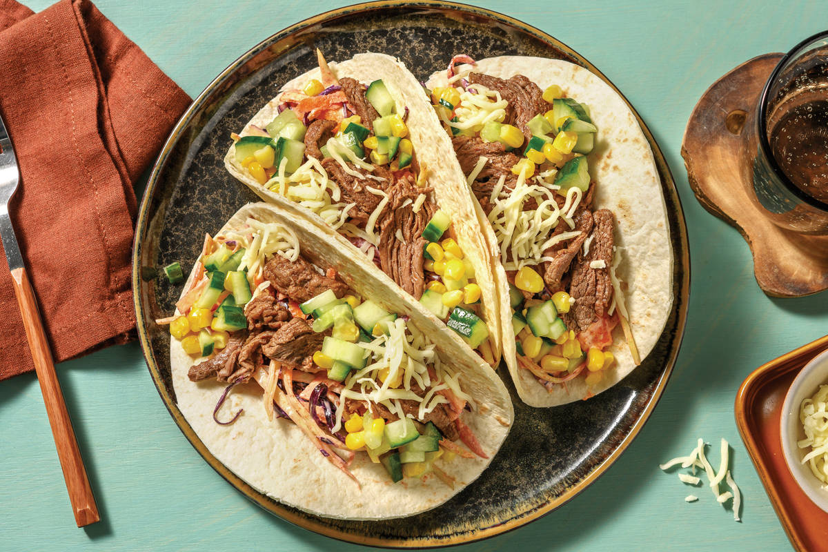 • Fill each tortilla with a helping smokey slaw. Top with spiced beef and corn-cucumber salsa. • Spoon over any extra juices from the pan. • Sprinkle with shredded Cheddar cheese to serve. Enjoy!