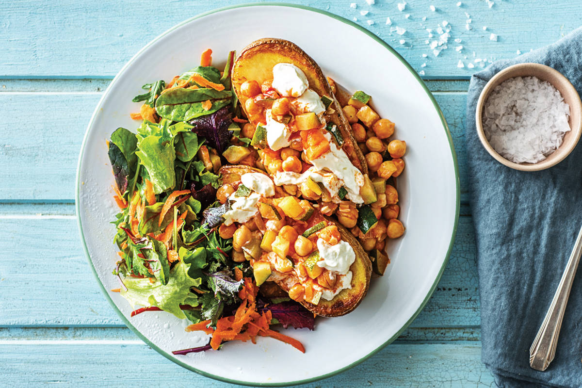 Divide the quick jacket potatoes between plates and top with the spiced chickpeas and a dollop of Greek yoghurt. Serve the salad on the side.