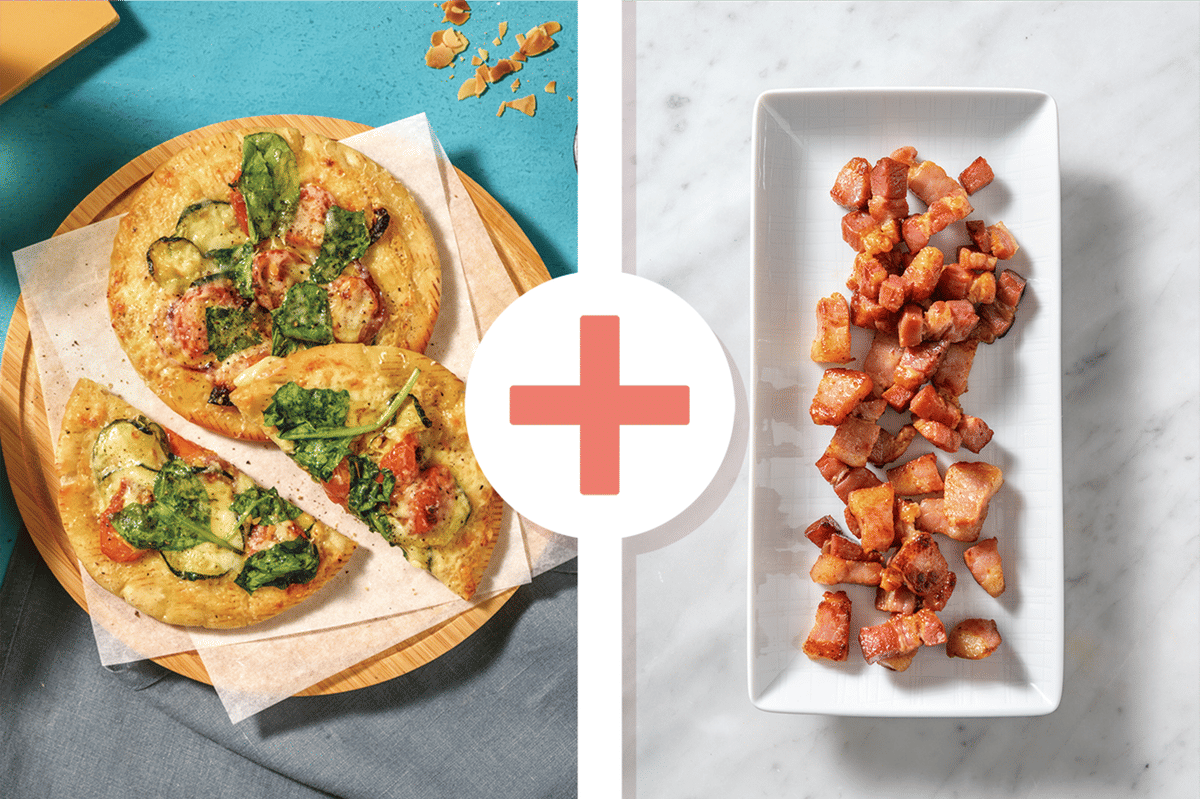 • Season the roast veggie and bacon flatbread pizza bianca with pepper, then divide between plates. • Serve with nutty spinach, rocket and fennel salad. Enjoy!