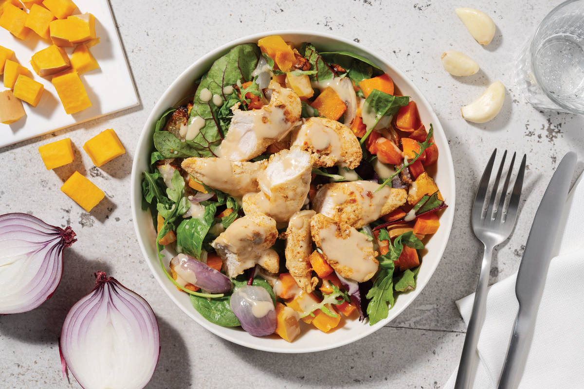 • Slice the chicken if preferred. • Divide roast pumpkin salad between bowls then top with satay chicken. • Spoon over coconut-makrut lime sauce. Enjoy!