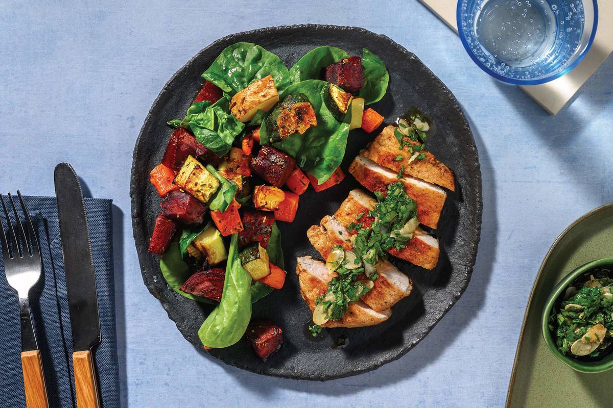 Get some pork on your fork with this easy number! While your Mediterranean-spiced veggies crisp up to perfection in the oven, you'll be searing Nan's spiced pork on the stove and perfecting the balsamic-almond crumb which will take your pork steaks to the next level! *This recipe is under 650kcal per serving.*