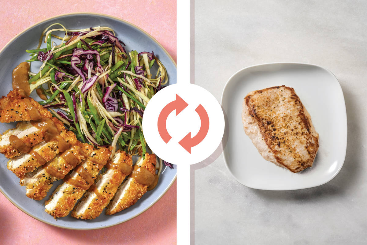 • Slice Japanese-style pork schnitzel. • Divide schnitzel and pea slaw between plates. • Drizzle katsu sauce over schnitzel to serve. Enjoy!