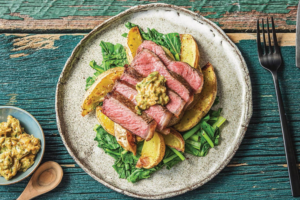 Divide the blanched spinach leaves between plates and top with the Mediterranean fries and sliced beef. Spoon over the herby butter.