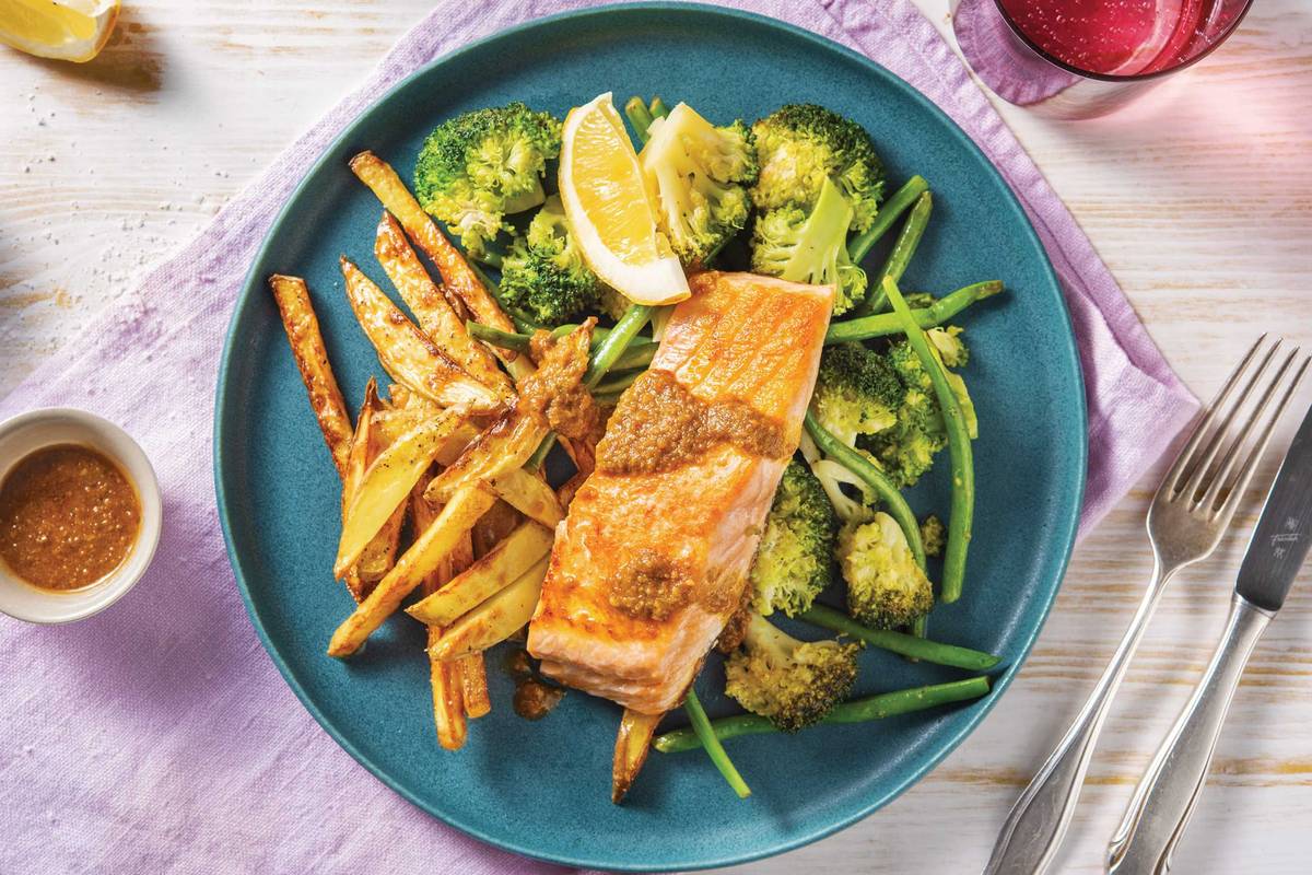 Divide the potato fries, salmon and buttery greens between plates. Spoon the red pesto over the salmon and serve with the lemon wedges.