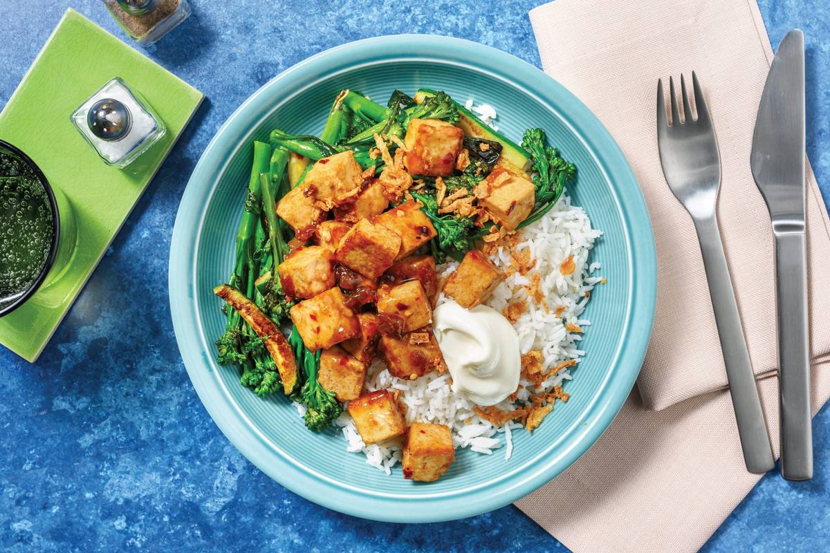 • Divide garlic rice between bowls. Top with veggies, chicken and sweet-soy tofu. • Spoon over any remaining plum sauce from pan. • Top with crispy shallots. Serve with plant-based aioli. Enjoy!