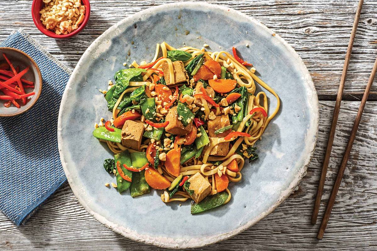 Return the wok or frying pan to a medium-high heat with a drizzle of olive oil. Add the carrot and cook, tossing, for 2-3 minutes, or until tender. Add the snow peas, garlic and ginger and cook for 1 minute, or until fragrant. Add the Asian greens and cook, tossing, for 1-2 minutes, or until wilted. Add the udon noodles and tofu and toss until heated through.