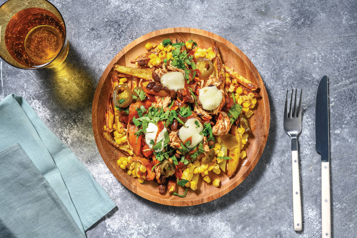 • Divide fries between plates. Top with Tex-Mex chicken and black beans, spooning over any extra sauce from the baking dish. • Top with light sour cream, mild chipotle sauce and pickled jalapeños (if using). • Tear over coriander leaves to serve. Enjoy!