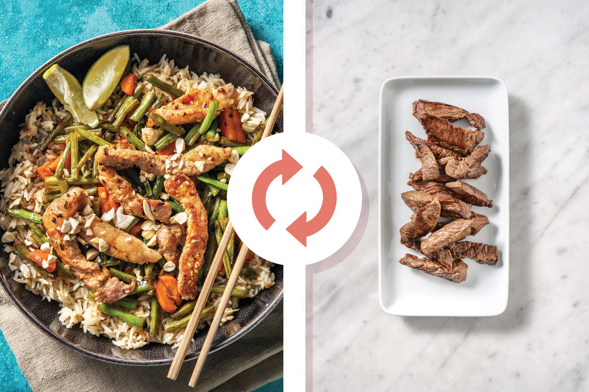 Return the frying pan to a medium-high heat. Add the green beans and carrot to the pan with the water (for the veggies) and cook, tossing, until just tender, 3-4 minutes. In the last minute of cooking time, add the sweet chilli sauce, soy sauce and beef strips to the pan and toss to coat.