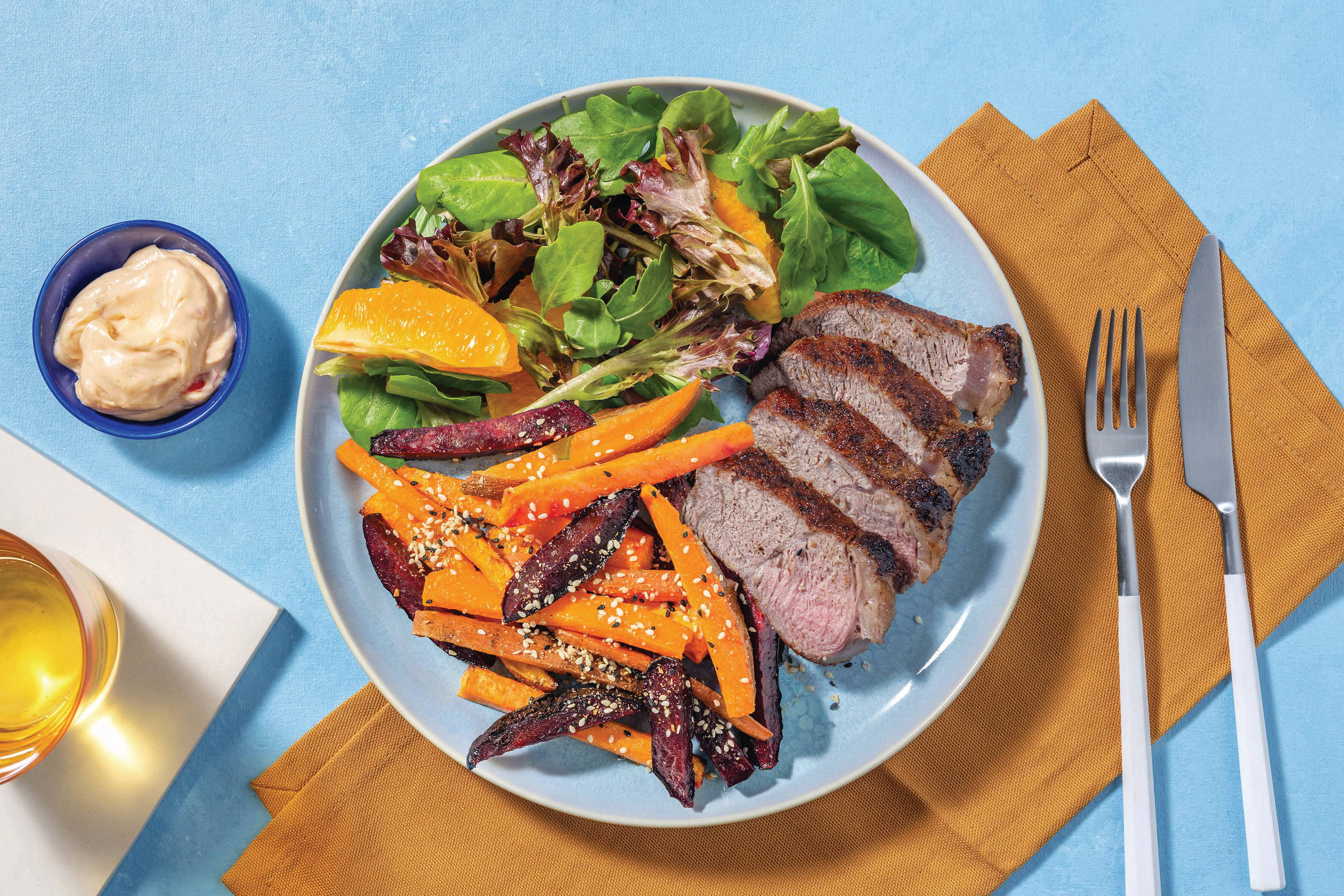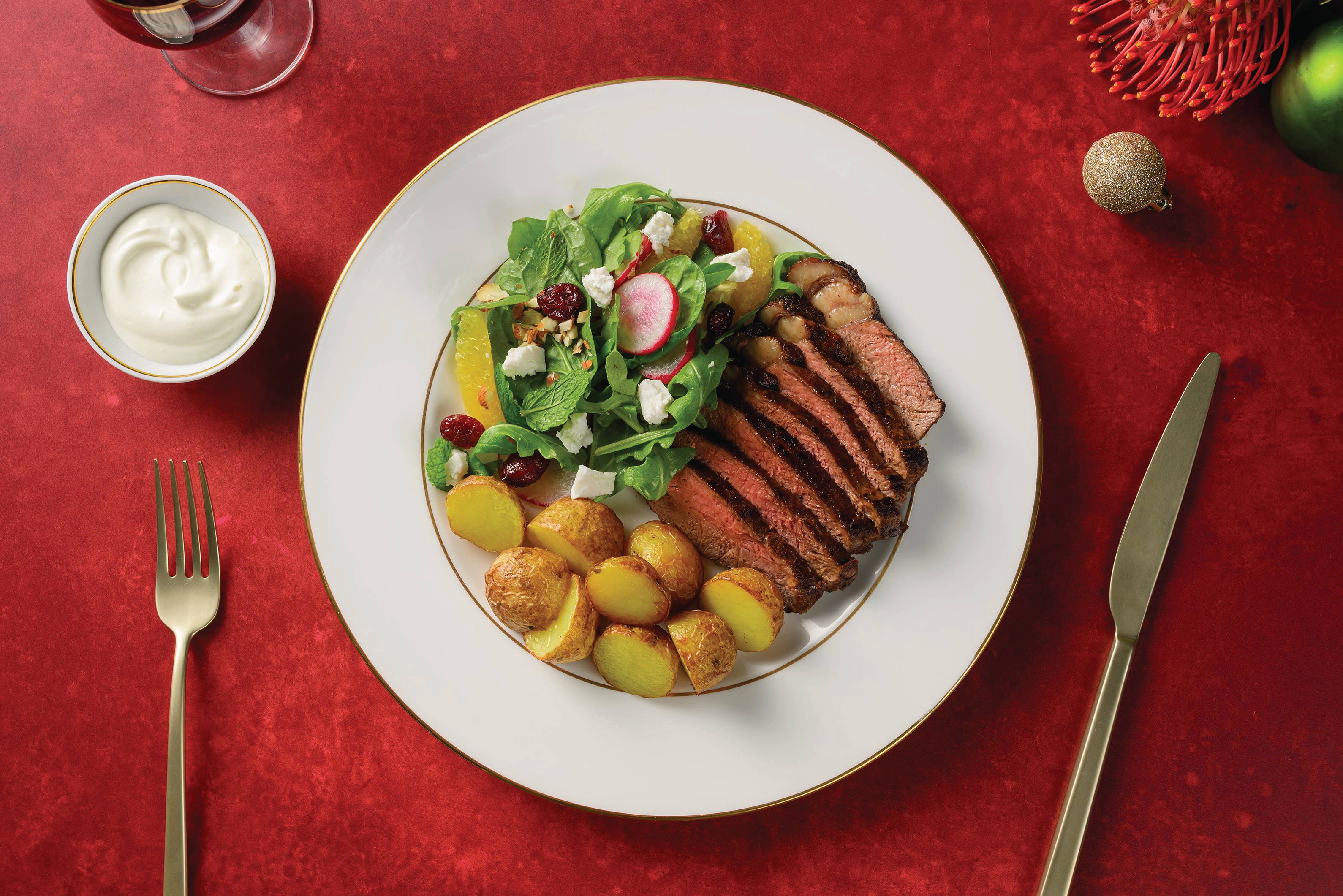 In a medium bowl, combine the orange marmalade, rosemary and squeeze in the juice from 1/2 an orange. Season with salt and pepper and whisk to combine well.